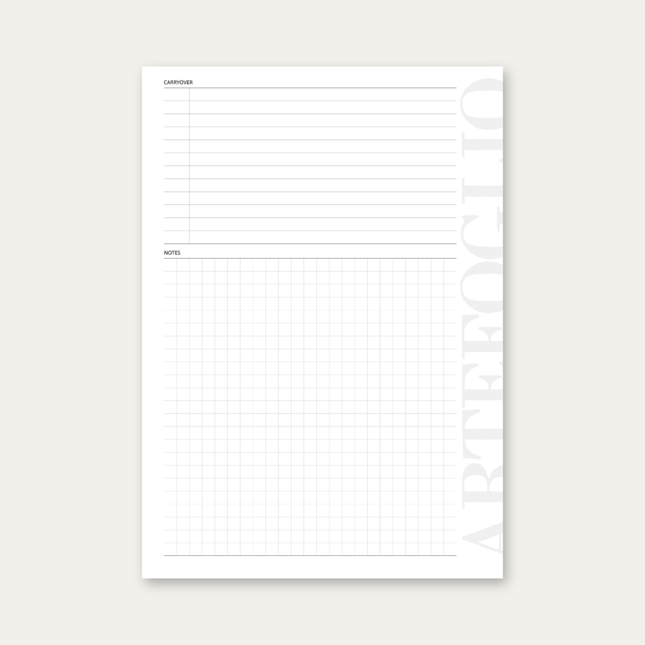 Quarterly planning set designed to break annual goals into focused, actionable plans across the entire year. Includes all four quarters (Q1–Q4), each with a structured overview, targets, action plan, key dates, risks and blockers, carryover, and notes. Built to support alignment, execution, and review over 13-week cycles. Part of Artefoglio’s Strategy Set, connecting annual direction with monthly and weekly planning.